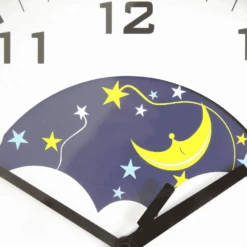 This graphic rotates with the hour hand, displaying the sun during the day and the moon at night, and it requires a 1xAA battery (not included).