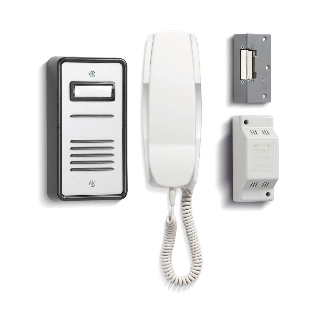 The Bell Surface Mount 1 Way Door Entry System consists of a telephone unit with a lock release button, an electric door release lock, a transformer, a faceplate and a surface mounted door station.
