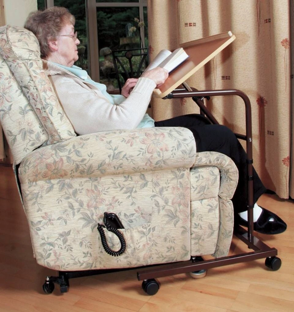 This table can be used for use over a bed or a chair and has casters for moving it into position.