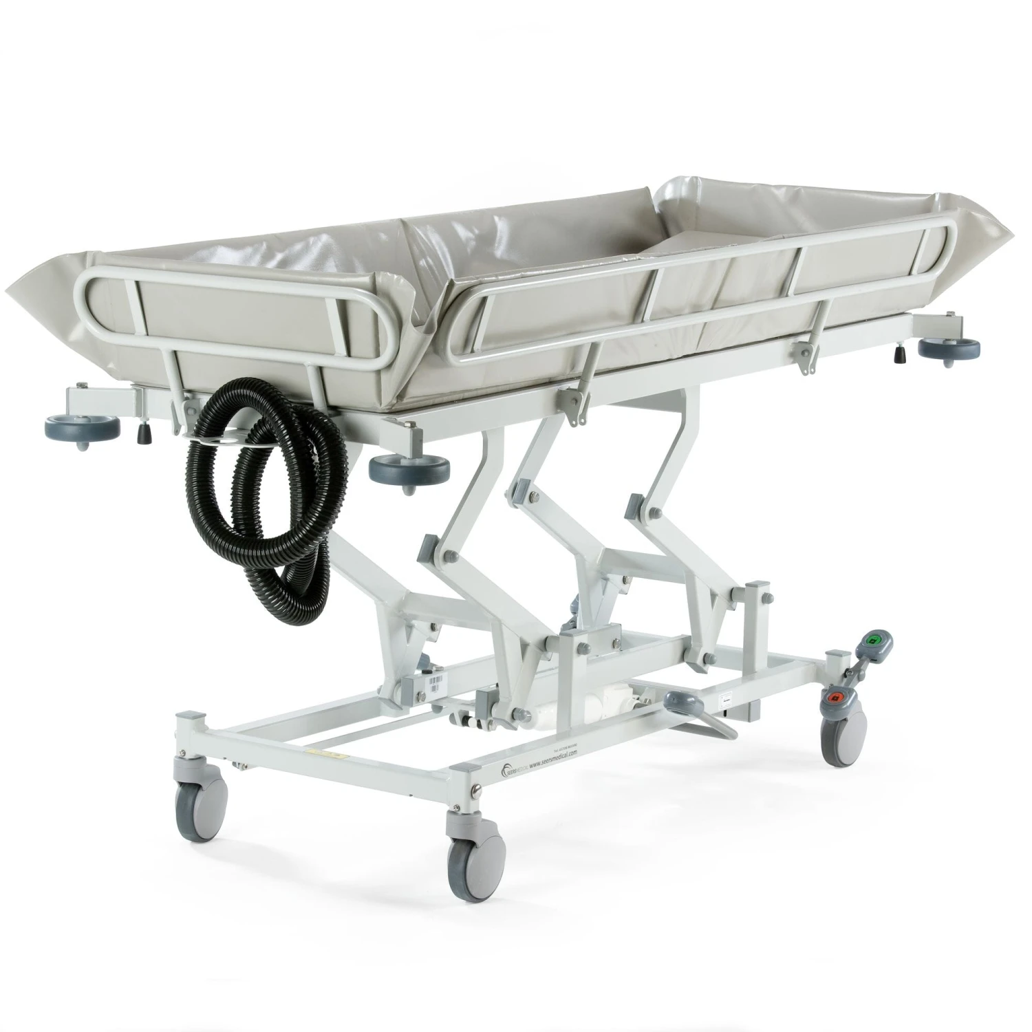 - : Designed to transport patients to and from the showering area, the trolley comes with a foam-padded PVC liner with side supports, end panels, and an additional patient support cushion, ensuring maximum comfort and security.