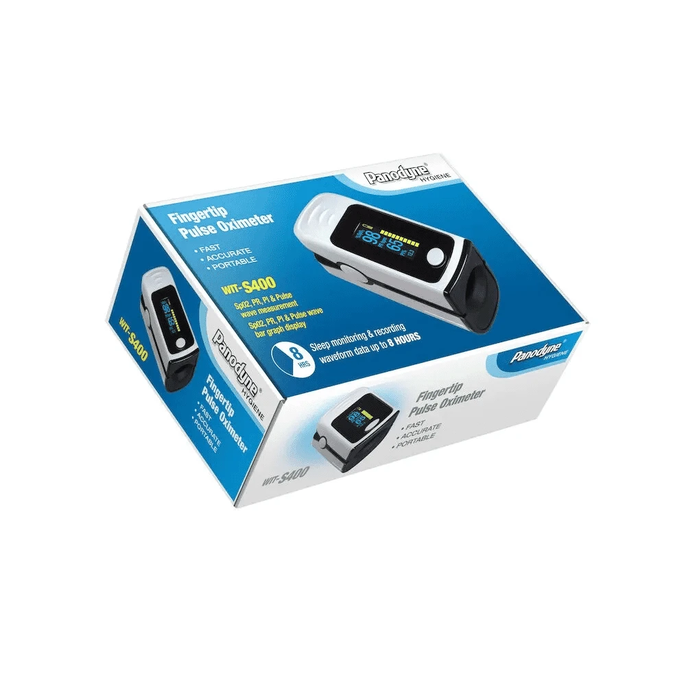 The Panodyne S-400 Pulse Oximeter is a lightweight, portable device that attaches to the end of the user’s fingertip for quick and efficient, oxygen, pulse and perfusion index measuring.