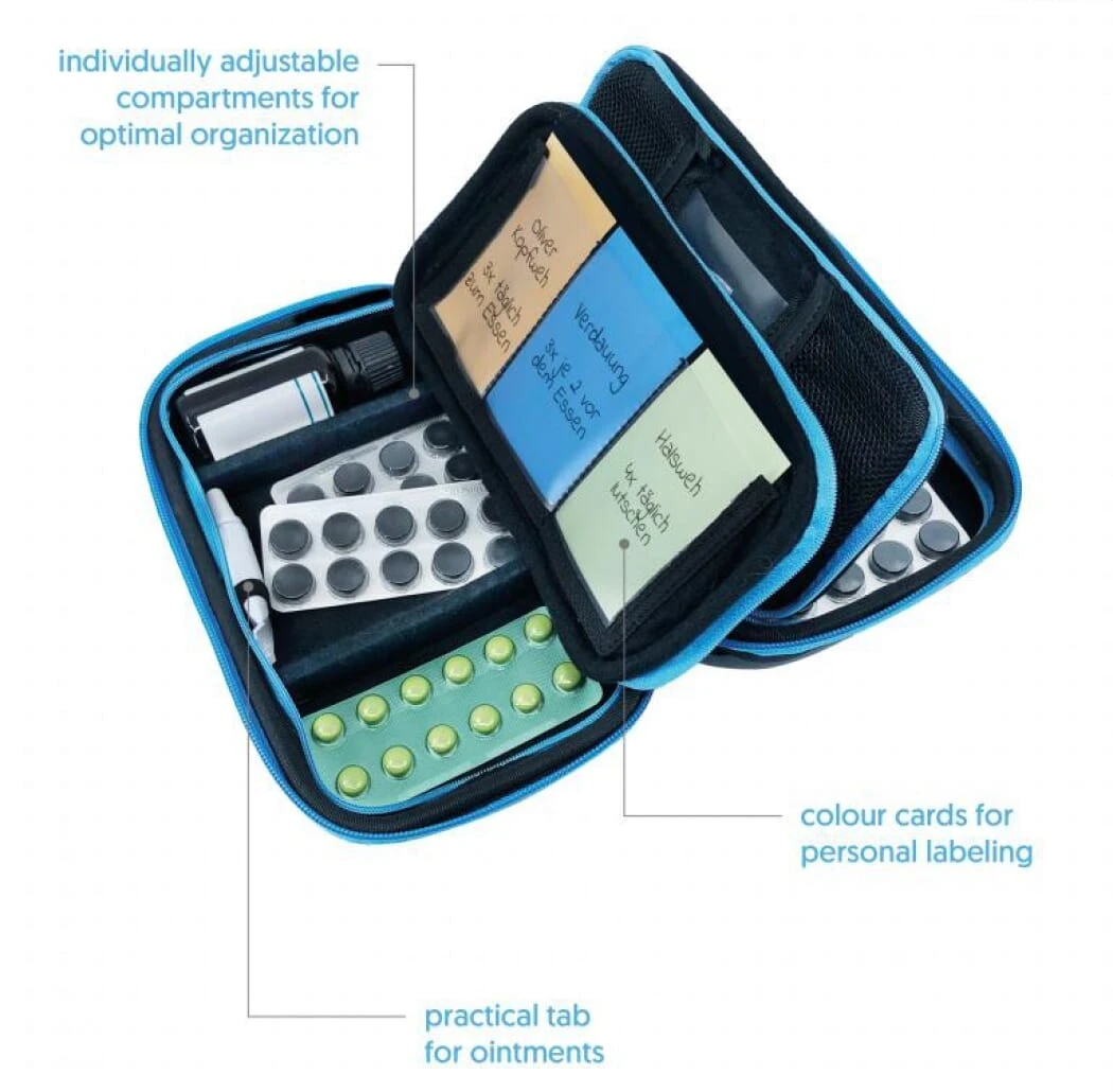 Featuring special colour cards for labelling and assigning the adjustable compartments for your individual needs, the Pillbase Travel Case is a must-have travel companion.