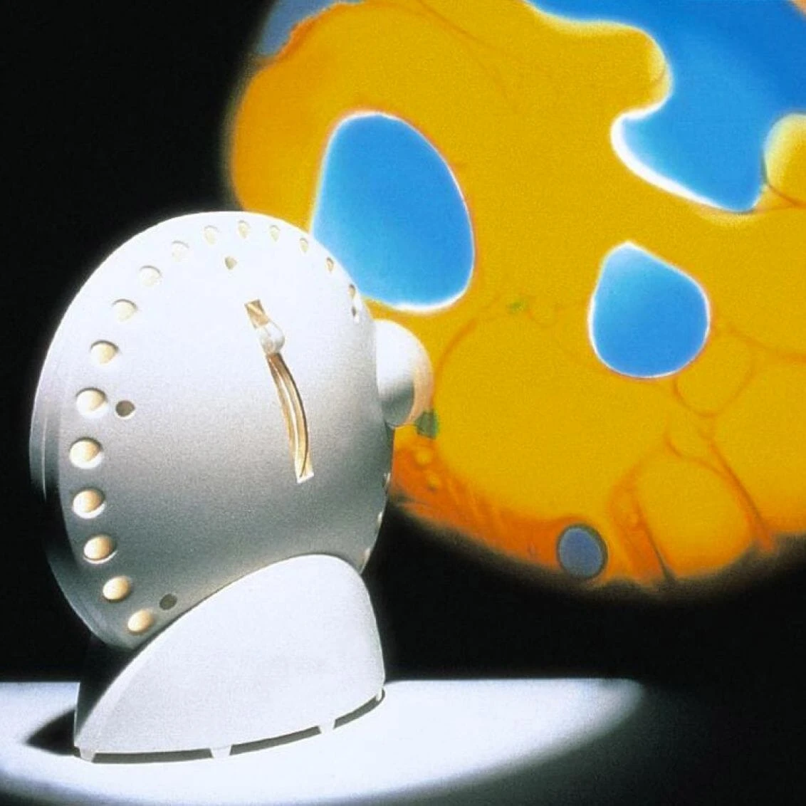 It projects an image onto the wall by back-lighting a compartment filled with coloured oils.