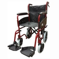 The Z-Tec Folding Aluminium Transit Wheelchair With Hand Brake is available in two colours, Metallic Blue or Metallic Red.