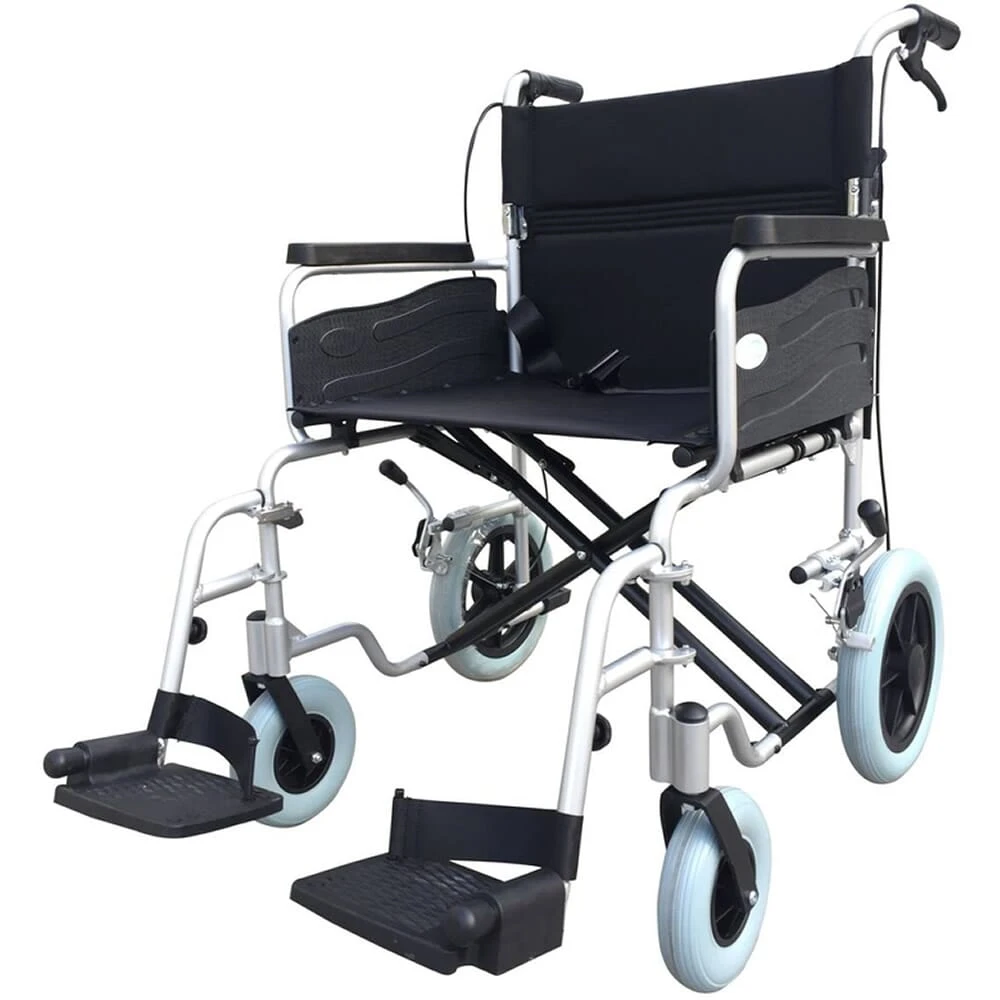 The Z-Tec Wide Aluminium Transit Wheelchair has a 22-inch seat width and a capacity of 20 stone.